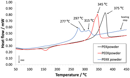DSC thermograms for PEK, PEEK and PEKK powders for one heating cycle.