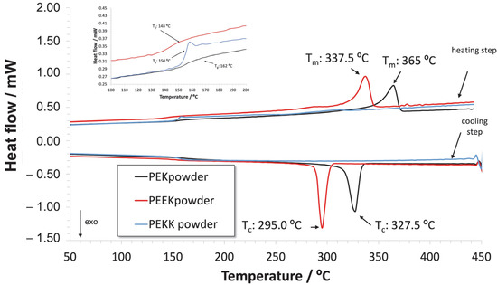 DSC thermograms for PEK, PEEK and PEKK powders. The insert shows a magnification of the thermograms for the glass transition temperature range.