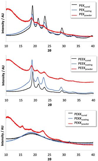 - PEK and PEEK show crystalline character after being subjected to the curing cycle. PEKK, on the other hand, shows some crystallinity as received from the supplier, but becomes amorphous after curing, probably due to its crystallization demanding much slower cooling conditions than the ones used in the process.
