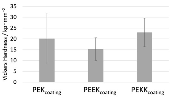 Figure 10 displays the Vickers hardness values for the coating formulations without PTFE, showing that there are no significant differences between the samples. PEKK, shown to be non-crystalline, would be expected to have lower hardness. However, the glassy character of all polymers seems to be prevalent factor.