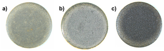 Optical microscopy images of punched 6mm pins: (a) PEK + PTFEcoating, (b) PEEK + PTFEcoating, and (c) PEKK + PTFEcoating.