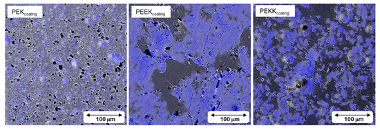 The SEM images presented in Figure 12 show that the PEK coating contains more surface defects, in the form of pinholes, than the PEEK and PEKK based coatings. These are commonly associated with air bubble retention within the coating film. Air bubbles are present in the interstices between the binder particles, after water evaporation, or are entrapped in substrate asperities. Upon curing, the binder melts, starting the particle coalescence process and formation of a continuous film. The air bubbles move towards the surface and burst, creating microcraters. These may disappear if the binder possesses sufficient fluidity to coalesce and close the pinhole [45]. The fact that PEK shows many more pinholes than PEEK or PEKK suggests that film coalescence has been hindered, probably due to higher melt viscosity, i.e., higher molecular weight of this polymer. Since no such information is available for these polymers, this hypothesis cannot be confirmed.