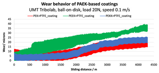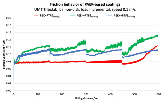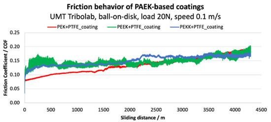The low starting friction of PEEK and PEKK coatings can be attributed to PTFE rich surfaces because of the PTFE filler stratification within the polymer matrix. Wear of the coatings causes a change of the PTFE-matrix-ratio. The initial PTFE-rich surface is worn, revealing the underlying coating with a higher portion of binder material, which has a detrimental impact on the friction performance because of more adhesive interactions. In PEK, PTFE is apparently more homogenously distributed within the binder, resulting in a very uniform friction characteristic throughout the entire test duration. The fact that PEKK is amorphous, as discussed before, can lead to different interaction between binder and PTFE particles, resulting in different tribological performance (e.g., different transfer film forming capabilities—such topics are currently under exploration).