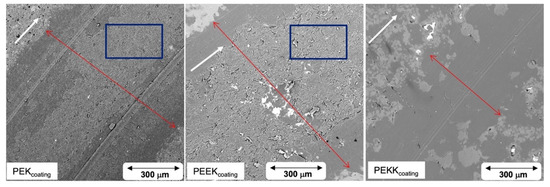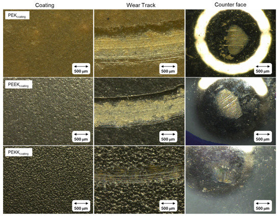 The PEKK coating possesses the narrowest wear track width, while the widest occurs for the PEEK coating. PEKK coating is mostly intact and just shows typical running-in wear marks like a smoothing of the coating. The image also corroborates the previous statement regarding the filler gradient, i.e., the surface of the wear track appears binder-rich, explaining the higher friction. A different micro-structure is also noticeable across the entire wear tracks of the PEK and PEEK coatings, which can be linked to distinctive exposure of the metallic substrate.