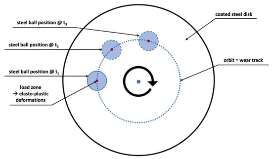 The majority of the coatings failed completely throughout testing making the assessment of the acting wear and failure mechanisms by surface inspections impossible. Nevertheless, the smooth surface of the steel ball will introduce distinctive adhesive interactions which can lead to continuous material wear but can also cause severe damage like tensile cracks due to high adhesion. The punctual load zone is moving along an orbit on the coated steel disk, as shown in Figure 18, and thus generates a reoccurring local elasto-plastic deformation of the coating which can provoke fatigue wear of the coating (cracks, crack propagation and release of loose coating fragments). Shorter tests are planned to allow for surface inspections and to gain more insights regarding the acting mechanisms that led to failure.
