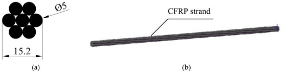 The prestressed tendons used in this test are CFRP strands with nominal diameter of 15.2 mm produced by Jiangsu Lianyungang Zhongfucarbon-core Cable Technology Co., Ltd (Lianyungang, China). The effective cross-sectional area of the CFRP strands are 137.44 mm2. The mono-wire is produced by the pultruded molding process, and the CFRP strands are made of 7 wires through continuous carbon fiber mono-wire dipping, twisting, molding, and curing. The material property test results of CFRP strands are provided by the manufacturer. The cross-sectional dimensions and physical properties of the CFRP strands used in the test are shown in Figure 1 and Table 1.
