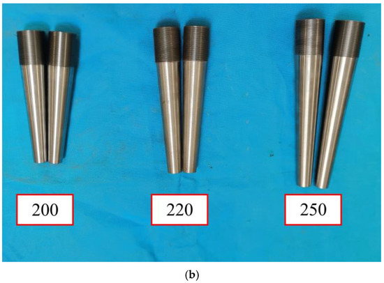 In this paper, a total of six groups of the experiment were designed, namely the anchor control group and the adhesive medium control group, and the number of specimens in each group was 2. Among them, the anchor control group was set up with three groups of 200 mm, 220 mm, and 250 mm to evaluate the influence of the increase in the length of the anchor; the inner taper decreased in turn, and the bonding medium was epoxy resin. The bonding medium control group set up again with three groups of bonding mediums such as epoxy resin, epoxy resin mortar, and UHPC-GJL. In order to facilitate the statistics of the test results, the specimen numbers of the anchor control group are 200-X, 220-X, and 250-X, and the adhesive medium control group are E-X, EM-X, and GJL-X, where X represents the number of the specimen. The test specimen in this paper is composed of CFRP strand and two anchors, which are shown in Figure 5.