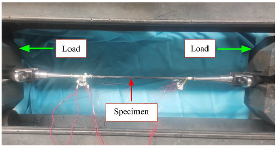 The test adopts the horizontal tensile testing machine with a maximum tensile force capacity of 600 kN of Zhongfu Carbon Core Cable Technology Co., Ltd (Lianyungang, China). In order to avoid additional torque of the specimen during the loading process, the specimen is fixed in the form of hinges. The chuck of the testing machine clamps the Y-shaped tooling, the Y-shaped tooling is connected with the ear plate through the pin shaft, and the ear plate is connected with the conical anchor through the thread, as shown in Figure 9 after assembly. According to the specification recommendations, this test adopts the displacement loading method, and the loading speed is 1.5 mm/min. In addition, the strain gauges are connected with the dynamic strain acquisition instrument by wire, and the acquisition instrument monitors the strain of the specimen in real time. The loading diagram of the specimen is shown in Figure 10.