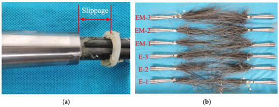 It can be observed from Table 4 that in the anchoring control group, the anchoring efficiency of the 200 mm anchor is the best, the lowest anchoring efficiency is 91.8%, the average anchoring efficiency is 96.4%, and the variance is the smallest, which is 18.8(%)2. It shows that the anchor can reliably anchor CFRP strands when pouring epoxy resin. Compared with 200 mm anchors, the minimum anchoring efficiencies of 220 mm and 250 mm anchors were 83.6% and 87.7%, respectively, and the average anchoring efficiencies were 92.7% and 93.8%, both lower than 95%. The variances are 81.9(%)2 and 36.6(%)2, respectively; the variance is large and the data is more discrete. It shows that the anchoring performance of the above two anchors is not very reliable. Therefore, in the follow-up adhesive medium control group, the 200 mm anchor with better anchoring performance will be used.