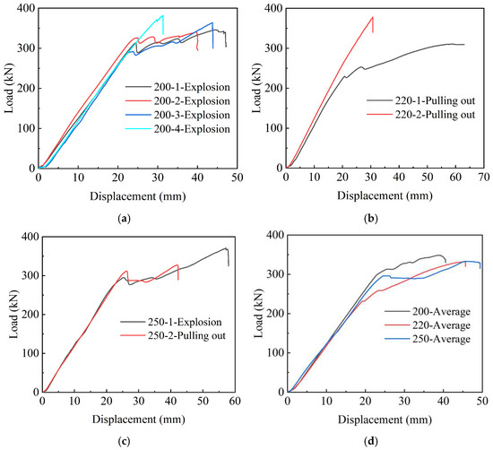 In order to more intuitively demonstrate the loading process of each specimen in the two control groups, the force–displacement relationship curves of the two control groups are drawn and presented in Figure 12 and Figure 13. It can be observed from Figure 12a–c that all the three 200 mm, 220 mm, and 250 mm anchors are shown with linear characteristics in the initial stage. Hence, the bonding medium in the anchorage can reliably anchor the CFRP strand under the combined action of the hoop pressure of the anchorage, the bonding force between the anchorage, and the bonding medium and the frictional force. When the tensile load increased to a certain value, most of the curves fluctuated because the epoxy resin in the anchor had a small deformation under the influence of pressure, resulting in a stress redistribution. In addition, a small part of the curve basically maintains the linear characteristics, and there is no large curve fluctuation, such as the two specimens, 200-4 and 220-2. It can be observed from Figure 12d that the average anchoring performance of the 200 mm anchor is better than that of the 220 mm and 250 mm anchors.