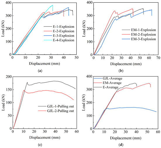 It can be observed from Figure 13a–c that under the same anchoring conditions, the force-displacement curves of the specimens poured with epoxy resin and epoxy resin mortar are basically the same as described above. The curves of the two groups of specimens are linear in the early stage and fluctuating in the middle stage. When a certain load is reached, explosive failure occurs. For the specimens poured with UHPC-GJL, the ultimate bearing capacity is lower, and all are less than 200 kN. It can be observed from Figure 13d that the anchoring performance of the specimen poured with epoxy resin and epoxy resin mortar is better, while the specimen poured with UHPC-GJL has greater slippage and poor anchoring performance.