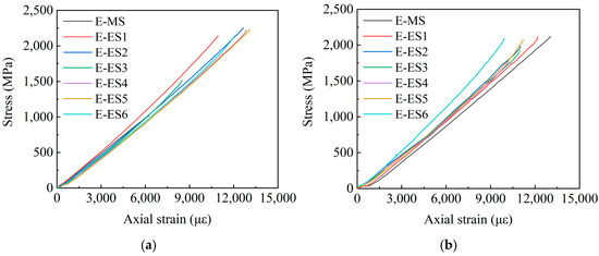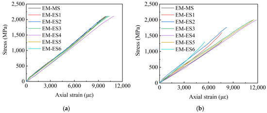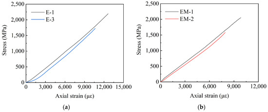 EM-X group stress–strain curve. (a) EM-1 stress–strain curve; (b) EM-2 stress–strain curve.