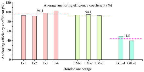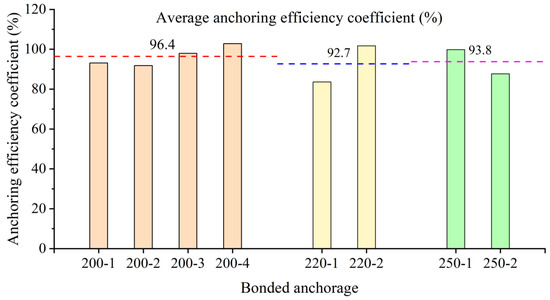 In this paper, the anchoring performance of tapered anchors with lengths of 200 mm, 220 mm, and 250 mm is experimentally studied and compared. The inner diameters of the three lengths of anchors are the same, and the taper shows a decreasing trend, which are 2.29°, 2.08°, and 1.83°, respectively. The anchoring efficiency coefficients of the three anchors are shown in Figure 16. It can be observed from Figure 17 that the anchor performance of the 200 mm anchor is better, as the anchoring efficiency is higher, and the average anchoring efficiency coefficient is 96.4%. The average anchoring efficiencies of the 220 mm and 250 mm anchors are 92.7% and 93.8%, respectively, and both are shown to have 3.7% and 2.6% less anchoring efficiency than the 200 mm anchor. In addition, in the 220 mm anchorage and the 250 mm anchorage, the difference between the anchoring efficiency coefficients of each specimen is large, indicating that the above two anchorages have comparatively poor anchorage performance. It can be observed that even if the length of the anchor section is increased, if the taper of the anchor is reduced, the anchoring performance will be greatly affected. It has been proved that the taper is the key factor affecting the anchor.