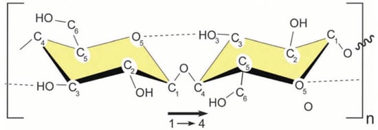 Schematic illustration of cellulose molecule, reprinted with permission from [26], 2011, RSC.