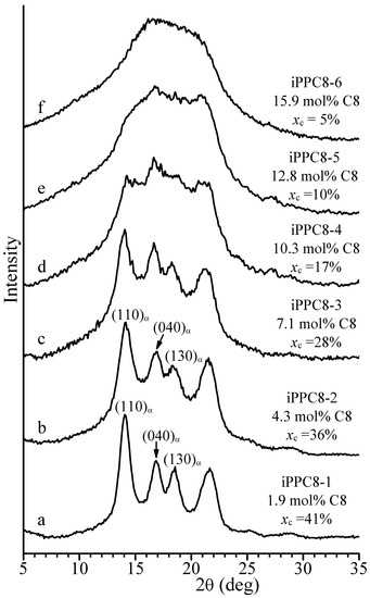 These data indicate that the γ form of iPP does not crystallize in these iPPC8 copolymers, even at high octene concentrations. Instead, this occurs in copolymers of iPP with ethylene (iPPC2) [72], butene (iPPC4) [72,81,92], pentene (iPPC5) [82,90,91,93], and hexene (iPPC6) [68,69,74,77]. Moreover, Figure 1 also indicates that the trigonal δ form does not crystallize in these iPPC8 copolymers, as instead occurs in iPPC5 [73,82,90,91,93] and iPPC6 [68,69,70,74,77] copolymers.