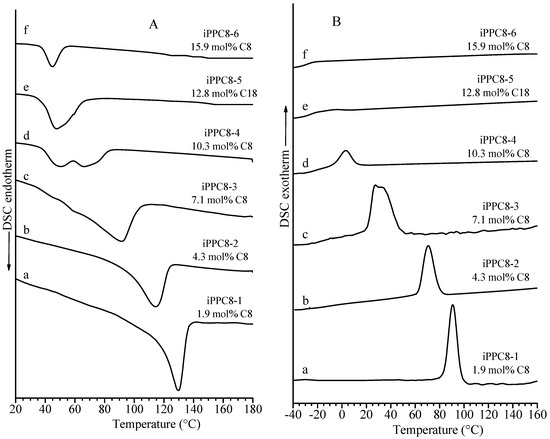 DSC heating (A) and cooling (B) curves of as-prepared samples of iPPC8 copolymers of the indicated 1-octene concentration (a–f).