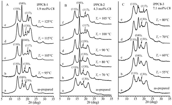 X-ray powder diffraction profiles of samples isothermally crystallized from the melt at the indicated crystallization temperatures Tc (b–f) of the samples iPPC8-1 with 1.9 mol% of octene (A), iPPC8-2 with 4.3 mol% of octene (B), and iPPC8-3 with 7.1 mol% of octene (C). The diffraction profiles of the as-prepared samples are also reported (profiles (a)). The (110)α, (040)α, and (130)α reflections at 2θ = 14°, 17°, and 18.6°, respectively, of the α form of iPP and the (117)γ reflection of the γ form at 2θ = 20.1°, are indicated.