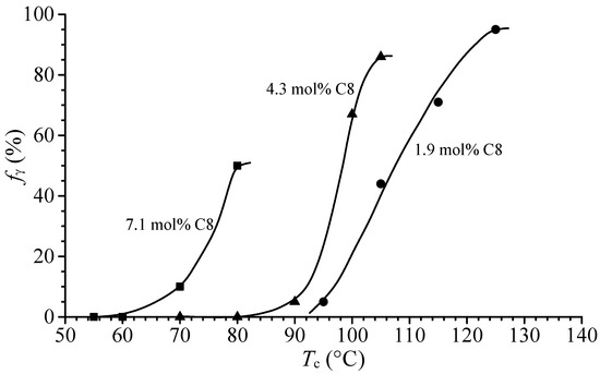 Relative amount of γ form (fγ) that crystallizes from the melt in samples of iPPC8 copolymers isothermally crystallized from the melt at the crystallization temperatures, Tc, as a function of the crystallization temperature Tc. (⬤) sample iPPC8-1 with 1.9 mol% of octene, (▲) sample iPPC8-2 with 4.3 mol% of octene, (■) sample iPPC8-3 with 7.1 mol% of octene.
