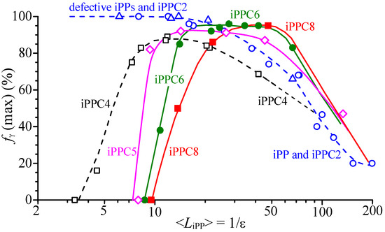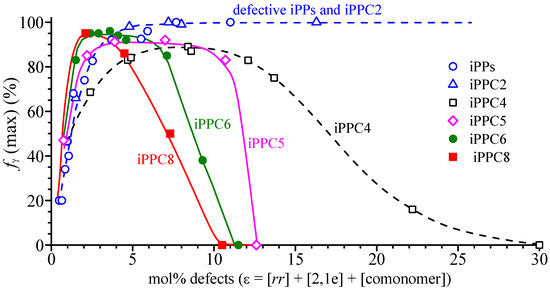 The two competing effects of interruption of the regular propene sequences of defects excluded from the crystals and the inclusion of defects into crystals define the crystallization behavior of iPP. The interruption effect induces crystallization of γ form [72,74,93,110], whereas the inclusion effect induces crystallization of α and δ forms [68,69,70,72,73,77,82,90,91,92,93]. For random copolymers and, generally, for iPP chains characterized by random distribution of defects along the macromolecules, the average length of the regular propene sequences is inversely proportional to the total concentration of defects ε and can be evaluated as <LiPP> ≈ 1/ε [110]. The data of the maximum amount of γ form fγ(max) of Figure 6 of all copolymers and of defective iPPs [72,74,93,110] are reported in Figure 7 as a function of the average length of the regular propene sequences <LiPP>. For the different copolymers, different relationships between <LiPP> and fγ(max) have been obtained [72,74,93,110], and iPPC8 copolymers give a new different behavior.