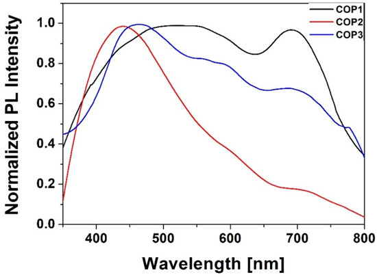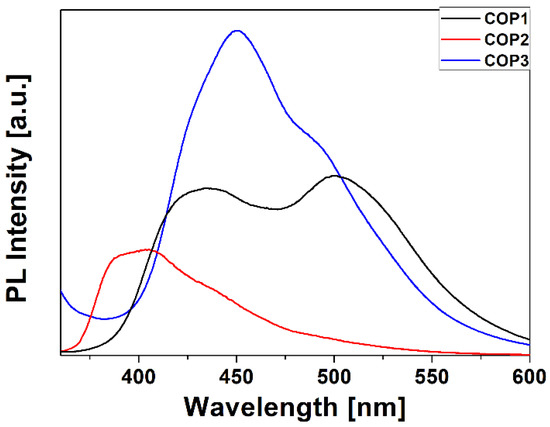 Figure 3 shows the photoluminescence (PL) spectra of the thin films of copolymers under excitation at 340 nm. These spectra were measured in the range of 360–600 nm. The COP1 copolymer is characterized by a broad band with two peaks in the 380–600 nm range. A band with a maximum at 450 nm corresponds to PMMA [30], while the band with a maximum at 500 nm corresponds to styrylquinoline [31]. For COP2, we observe a typical PMMA photoluminescence spectrum, which was presented in the work of Li [32], with the weak shoulder at 490 nm corresponding to styrylquinoline. The PL spectrum of the COP3 copolymer is characterized by a band in the 400–600 nm range, where the first band at 450 nm comes from PMMA and the second one at 494 nm is from styrylquinoline. The shift in the photoluminescence spectra for the StQ peak results from the choice of the substituent. In the case of COP1, we are dealing with a donor whose maxima are redshifted in relation to the other two acceptor copolymers. The bathochromic shift for the COP1 complex relative to COP2 and COP3 can be attributed to the lower band gap between HOMO and LUMO due to the presence of an electron-donating substituent (OCH3) [33], which is also confirmed by the theoretical calculations (corresponding HOMO-LUMO gap calculated with B3LYP/def2-SVP approach are 3.79 eV, 4.03 and 4.07, for Z isomers of COP1, COP2, and COP3, respectively).