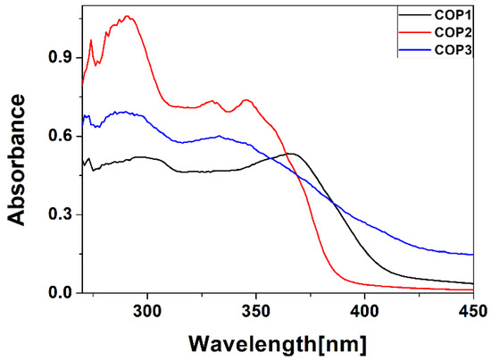 Figure 5 shows the absorbance spectra of the styrylquinoline copolymers. These spectra were measured in the range of 360–450 nm. For all of the copolymers, a band at about 273 nm and a broad band of 280–305 nm are observed, originating from π → π* transitions (compare Section 3.1 Theoretical results). Bands at around 330 nm and 350 nm for COP2 and COP3, respectively, and for COP1, the bands at around 370 nm are assigned to the π-π* transition of the styrylquinolines unit [35]. Due to the fact that quinoline is a heteroaromatic compound, the n → π* and the π → π* transitions are expected to be shown, however the band due to the n → π* transition is generally weak, while the bands associated with the π → π* transitions do not present fine structure and are observed in two regions, which cover up the band owed to the n → π* transition and showed two maximum absorption peaks [35].