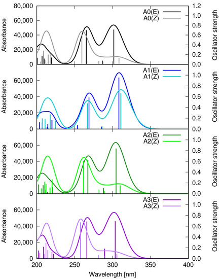 Absorption spectrum for A0–A3 isomers, calculated within the ωB97X-D/def2-SVP approach in vacuum. Dark lines correspond to the more stable E isomers, and light lines—to the less stable Z isomers.