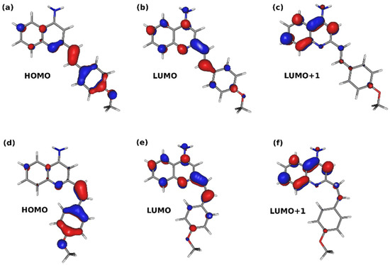 Frontier molecular orbitals of E and Z isomers of A1: (a) A1-E HOMO, (b) A1-E LUMO, (c) A1-E LUMO+1, (d) A1-Z HOMO, (e) A1-Z LUMO, (f) A1-Z LUMO+1.