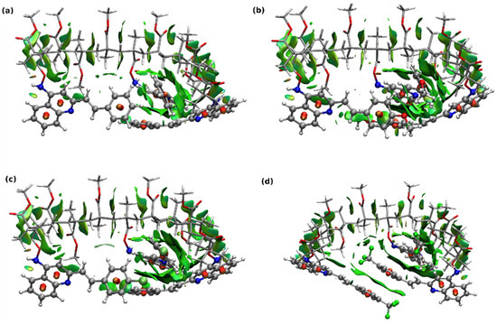 Optimized exemplary copolymer model structures with the non-covalent intramolecular interactions generated in NCIPlot depicted as the green surfaces. For better visibility, the copolymer chain is drawn with the licorice representations and styrylquinoline units—in CPK. (a) COP0, (b) COP1, (c) COP2, (d) COP3.