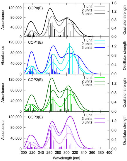 The vertical absorption spectrum of COP0-COP3 is presented in Figure 10. The position of the most intensive signals is conserved in the sequence A-COP (short)-COP (medium)-COP (long), and the observed shifts do not exceed several nm. On the one hand, this proves that even the short copolymer model should well reproduce its real photophysical properties and, on the other hand—that the introduction of the styrylquinoline chromophores to the polymer material should not unfavorably decrease their absorption.