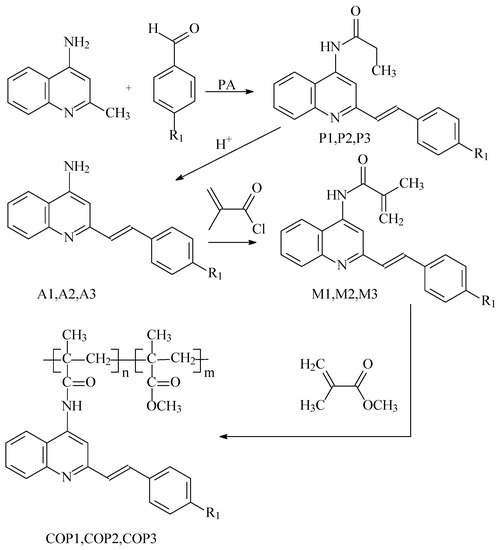 Condensation reactions in propionic anhydride (PA) were used to obtain the initial aminostyrylquinolines from 4-amino-2-methylquinoline and the appropriate benzaldehydes. The methacrylic monomers with styrylquinoline moiety were obtained through acylation reactions. The reactions of interaction methacryloyl chloride with amino derivatives A1, A2, and A3, were conducted in the presence of triethylamine.