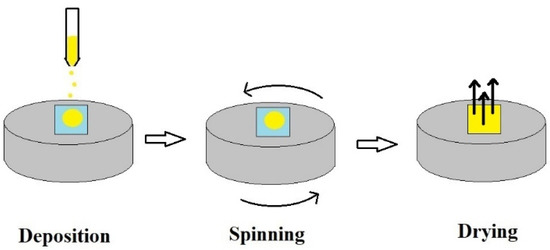 The spin-coating method was used for the fabrication of the samples of the polymers in the form of thin films. Before placing the polymers on the glass substrate, BK7 was filtered through a 0.4 μm pore size nylon syringe filter. The principle of deposition (of the mixture with certain viscosity) is based on a homogeneous spreading out of the solution on the rotating substrate with an adequate angular speed. We used 1,1,2 trichloroethane as a solvent to form a good-quality thin film. The same polymer concentration of 56 g/L was used. The thin film was prepared by mixture depositions using a spin-coater (Spin200i, POLOS) at a spin rate of 1500 rpm for 60 s (see Scheme 2). Immediately after the deposition, the films were cured in an oven at 50 °C for 180 min in order to eliminate any residual solvent. Their thickness was measured by a profilometer (Tencor, ALFA-Step), and in all cases, it was found to be 0.4–0.5 μm.
