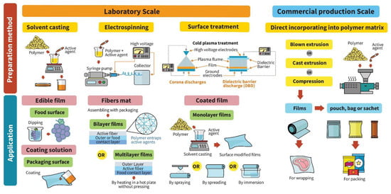 Functional packaging material with antifungal, antibacterial or antiviral properties is one alternative to preservative addition in bulk foods. Figure 1 presents different incorporation techniques used for developing antimicrobial activity and their applications on food products. Antifungal and antibacterial packaging developed by embedding or coating antibacterial agents in or on packaging materials extends the lag phase and reduces or inhibits the maximum cell count in the stationary phase of yeast, mold and bacterial growth [,,]. Recent research has investigated the antimicrobial efficacy of metal nanoparticles, organic acids and their salts, essential oils, natural extracts, enzymes and bacteriocins incorporated into polymer matrices via different methods including solvent casting, coating solution, surface modification, blown extrusion and cast extrusion. Polymer materials serve as vehicles for loading antimicrobial agents in food packaging such as films, coated films, edible films or coating, pouches and sachets. According to a report by ‘Credence Research’, the market for biodegradable food packaging is expected to reach USD 7058.8 million by the end of 2023, with a compound annual growth rate (CAGR) of 11% from years 2016 to 2023 []. Antiviral packaging is designed to improve food safety by either preventing cross-contamination on food surfaces or inactivating target-specific foodborne viruses. Antifungal and antibacterial packaging materials have been intensively studied, but scant research has addressed food-grade polymers and biopolymers with antiviral activity for food applications.