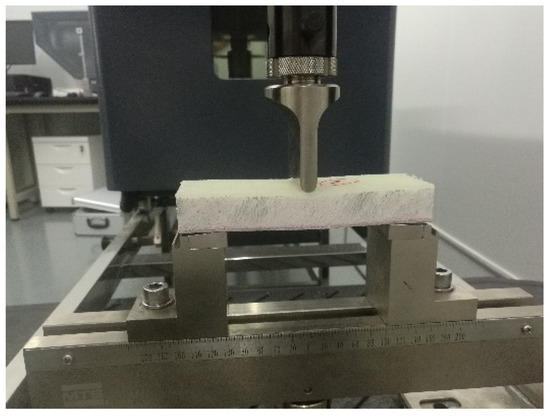 As a crushable foam of an elastic–plastic material, the core was modeled using hardening curves obtained from conducting uniaxial compression tests on square blocks. The elastic part of the foam was defined as an isotropic elastic option with two parameters: Young’s modulus and Poisson’s ratio. As shown in Figure 2, compression test curves were obtained to describe the crushable foam plasticity behavior [42]. The foam part was described as a solid shape in ABAQUS/Explicit. The element type of the foam was C3D8R, and 18,750 was the number of elements.