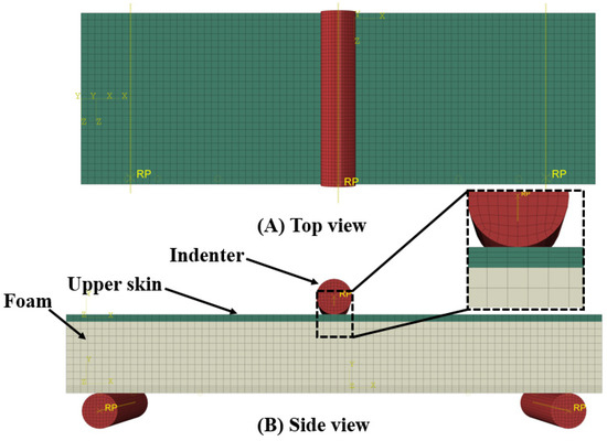 According to the ASTM C393 testing conditions, a three-point bending testing geometrical model was created, as shown in Figure 3. A graded mesh was created, and finely meshed was made in the region of the impact surface of the upper skin. An SC8R continuum shell was used to model the upper and lower skins. As a rigid body, the indenter was defined relative to the sandwich panel with a surface-to-surface contact interaction with normal and tangential behavior. The number of elements of the indenter was 2792. General static steps were defined with specific dissipated energy fractions.