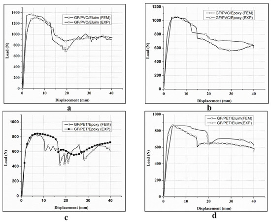 Load–displacement curves for flexural tests of GF/PVC/Elium (a), GF/PVC/Epoxy (b), GF/PET/Epoxy (c), and GF/PET/Elium (d) sandwich composites.