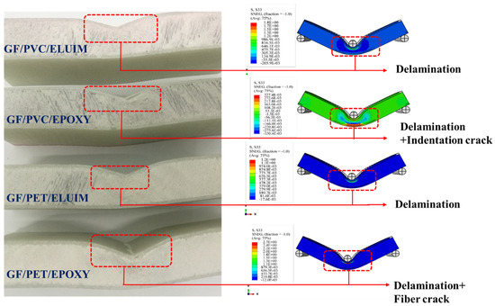 With the deepening of the application of the sandwich structures, in many cases, the sandwich structure will bear alternating loads, so the damage problem of the sandwich structure becomes greater; it becomes increasingly more prominent. The damage form can be attributed to the foam’s properties and the core material’s shear. The damage problem of the sandwich structure is more important than the other materials and structural forms used. Figure 7 and Figure 8 show comparisons between the experimental and numerical results of the damage and failure mechanisms of the GFRP sandwich composites.