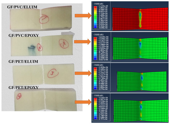 The upper and lower skins were modeled as an elastic material, with Glass/Epoxy and Glass/Elium, as presented in Table 1. The continuum shell section was used to define the structure of the upper and lower skins, the material type and thickness, and the orientation of each layer. The upper and lower face number of elements was 15,000. The “Tie” element was used for the upper and lower skins attached to the foam, and tangential and normal behavior was the interaction property between surfaces. Hashin’s failure criterion was used to predict the damage initiation in the upper skin, including four damage initiation mechanisms to detect the matrix and fiber under tension and compression failures [43,44,45]. The effect of Hashin’s damage can be seen when one of these failure modes occurs. The failure modes included in Hashin’s criterion are as follows: