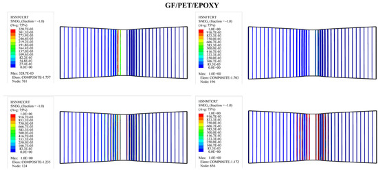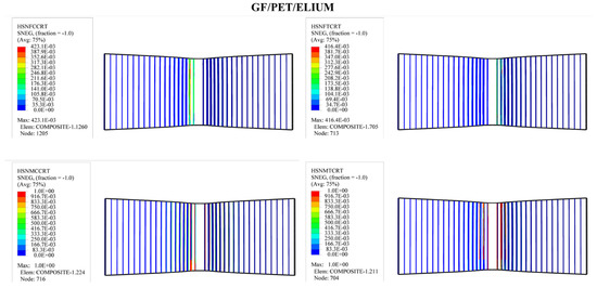 In order to predict the damage caused to fiber-reinforced composites, Hashin’s damage was used for GFRP sandwich composites, as shown in Figure 11, Figure 12, Figure 13 and Figure 14. Hashin’s criterion consists of four parameters: Hashin’s fiber compressive damage initiation (HSNFCCRT), Hashin’s fiber tensile damage initiation (HSNFTCRT), Hashin’s matrix compressive damage initiation (HSNMCCRT), and Hashin’s matrix tensile damage initiation (HSNMTCRT). From Figure 11, Figure 12, Figure 13 and Figure 14, it was found that the model could predict the initiation damage due to all the values of the predicted property being less than or equal to 1. Moreover, damage was only shown to occur on the impacted side of the indenter in the middle of the specimen with different colors.