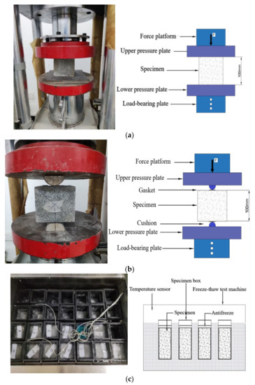 Testing device: (a) Compression test, (b) Flexural strength test, (c) Freeze–thaw cycle test.