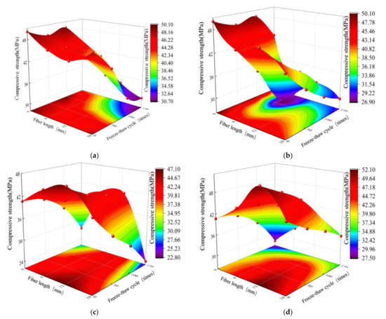 It can be seen from the fitting model that the values obtained by the fitting equation are all close to 1 and that the value of the coefficient of variation obtained by the model is very small, indicating that the correlation between the model and the test data is significant and the degree of fitting is high, which indicates the model can better analyze and predict freezing conditions. The effects of the PPF length and the number of freeze–thaw cycles on the antifreeze properties of PFNSC and PFMSC specimens within 150 thaw cycles are found. Figure 8 and Figure 9 show the optimal three-dimensional response surfaces and contour maps of the compressive and split tensile strengths of the PFNSC specimen and the PFMSC specimen obtained, respectively, based on the RSM model within 150 freeze–thaw cycles.