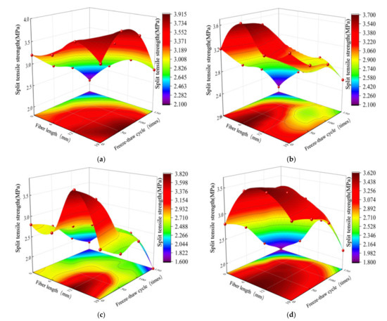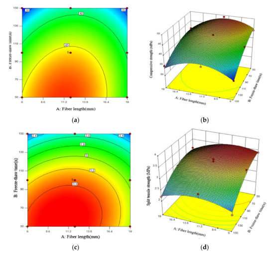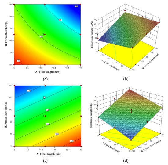 When the volume content of PPF is 1.2%, the PFNSC contour map and 3D response surface are as shown in Figure 8. Through the analysis of Figure 8a,b, it can be seen from the contour map that the green on both sides gradually changes to orange in the center and that the center is the region with the highest responsivity, indicating that the material content corresponding to this region is the optimal doping value. In the three-dimensional response surface graph, the variation trend of the R value along factor B is greater than that of factor A, indicating that factor B (number of freeze–thaw cycles) has a greater impact on the R value than factor A (fiber length). When the number of freeze–thaw cycles increased from 50 to 150, the compressive strength and split tensile strength of PFNSC decreased by 27.5 MPa and 1.8 MPa, respectively; that is, the strength of the specimen decreased with the increase in the number of freeze–thaw cycles. When the fiber increased from 6 mm to 19 mm (1.8 MPa), the strength of the specimen showed a trend of first increase and then decrease, and when the fiber length was approximately 10 mm, the tensile strength reached the maximum. As can be seen from Figure 8c,d, the green on the top of the contour map gradually changes to the red on the bottom. The region below the center is the region with the highest response, and the corresponding polypropylene fiber length and the number of freeze–thaw cycles reach optimum values. The density of the contour lines on the ordinate in the split tensile strength contour diagram is greater than the density of the contour lines on the abscissa; that is, when the fiber volume content is 1.2%, the effect of fiber length on the split tensile strength is greater than that of freezing. The effect of the number of melting cycles is seen.