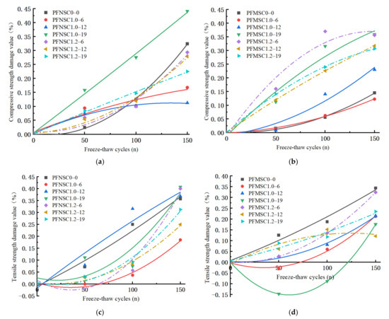 Strength damage under different freeze–thaw cycles: (a) PFNSC compressive strength damage rate, (b) PFMSC compressive strength damage rate, (c) PFNSC splitting tensile strength damage rate, (d) PFMSC splitting tensile strength damage rate.