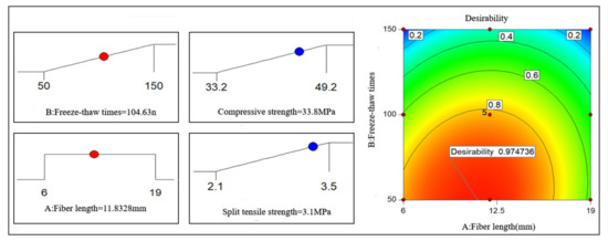 As shown in Figure 10, when the volume content of the PFNSC fibers is 1.2%, the response surface model can predict that when the number of freeze–thaw cycles is 105 and the fiber length is 11.8 mm, the compressive strength and splitting tensile strength of PFNSC are both at maximum values of 33.8 MPa and 3.1 MPa, respectively, indicating that PFNSC can maintain a good antifreeze performance within 105 freeze–thaw cycles. The desirability is 0.975, indicating that the model has high prediction reliability.