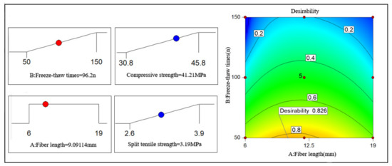 As shown in Figure 11, when the volume content of the PFMSC fibers is 1.0%, the response surface model predicts that when the number of freeze–thaw times is 96 and the fiber length is 9.1 mm, the compressive strength and splitting tensile strength of PFMSC are both at maximum values of 41.21 MPa and 3.2 MPa, respectively, indicating that PFMSC can maintain a good antifreeze performance within 96 freeze–thaw cycles. The desirability is 0.826, indicating that the model has high prediction reliability.