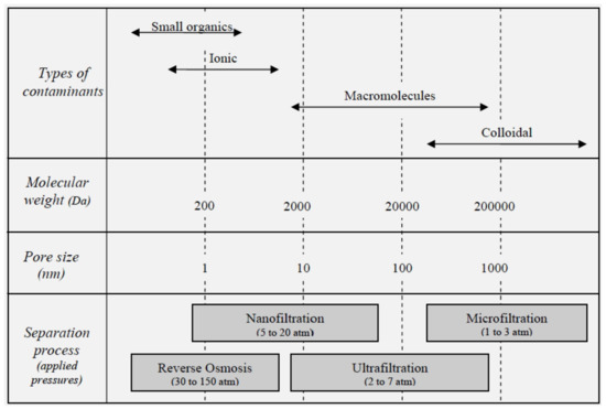 Filtration levels with equivalent particle rejection ranges and molecular weight cut-offs.