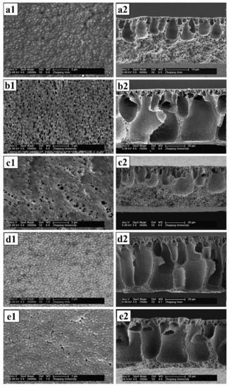 SEM images of top surface (left) and cross-section (right) of the membranes. (a1,a2) Pure PVDF, (b1,b2) PVDF/EPTBP, (c1,c2) PVDF/ACPS, (d1,d2) PVDF/HPE-g-MPEG and (e1,e2) PVDF/PEG. Provided with permission from Elsevier [25].