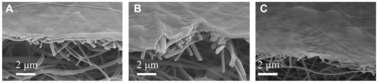 Cross-section SEM images thin film composite membranes of cellulose (A), chitin (B), and cellulose-chitin blend (C) barrier layers prepared by ionic liquid regeneration. Provided with permission from Elsevier [47].
