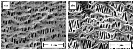 SEM micrographs of the surface of microporous membranes (20 m thick): (a) PP and (b) HDPE; DR = 90, H-AFR, cold stretching of 55%, followed by hot stretching of75%. Provided with permission by Elsevier. [53].