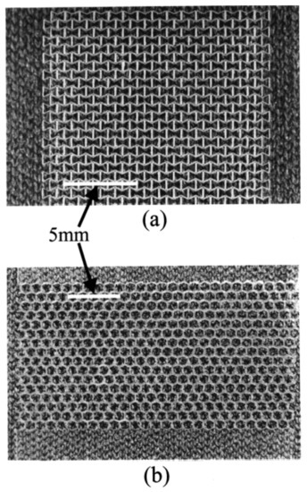 (a) Polymeric re-entrant honeycomb membrane; (b) polymeric conventional honeycomb membrane. Pores are approximately 1 mm in width (along the x direction). The membranes were fabricated by direct femtosecond laser ablation in air, with pulses at 790 nm (170 fs). Provided with permission from American Chemical Society [55].