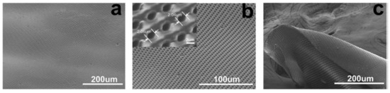 SEM images of (a,b) the obtained membrane with a well-distributed ordered cylindrical straight through-pore structure (pore size: 2 μm, distance between adjacent pores: 2 μm) in a large area from the imprint process, and (c) the bending of the membrane edge for clearly observing the through-pores. Provided with permission from IOPScience [56].